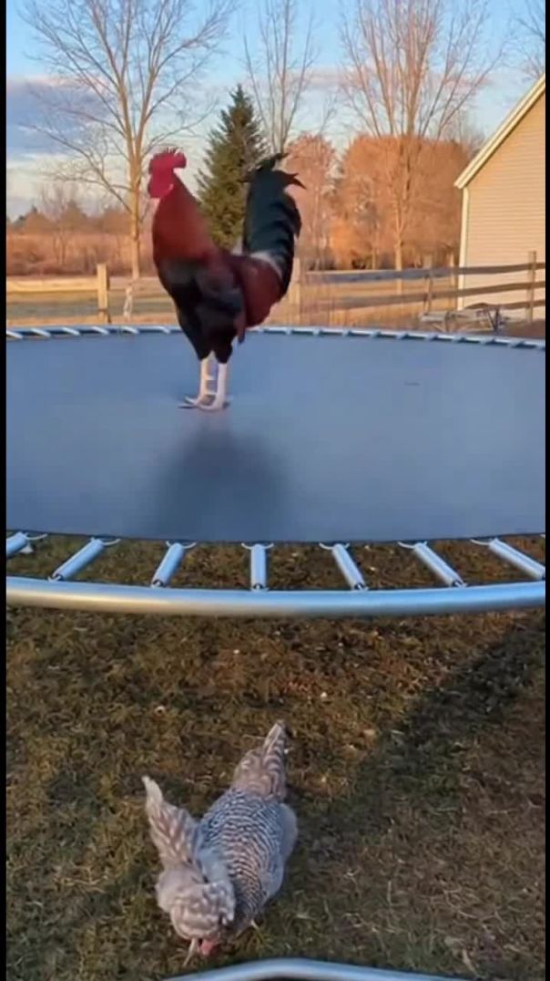 This chicken is having a blast on the trampoline 😂🐓