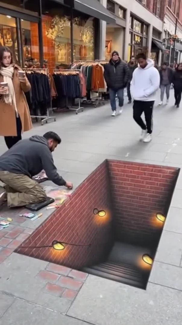 A bustling shopping street erupted into gasps and shouts when a man confidently stepped toward what he thought was an impressive piece of 3D sidewalk chalk